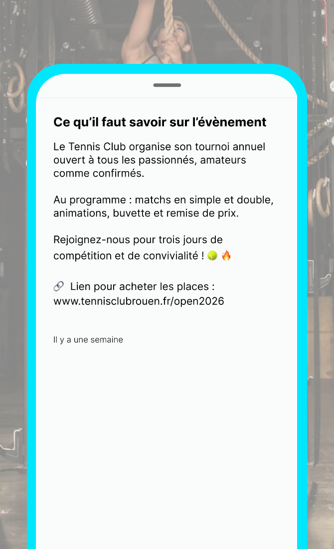 Sur Field, organisez tous types d’événements — tournois, stages, visioconférences, initiations ou soirées. Indiquez la date, l’heure, l’adresse physique ou le lien en ligne, et décrivez les temps forts. Grâce au bouton “Je participe”, suivez en temps réel qui rejoint votre événement : chaque clic s’ajoute au compteur pour évaluer facilement l’engagement et la portée de vos actions.