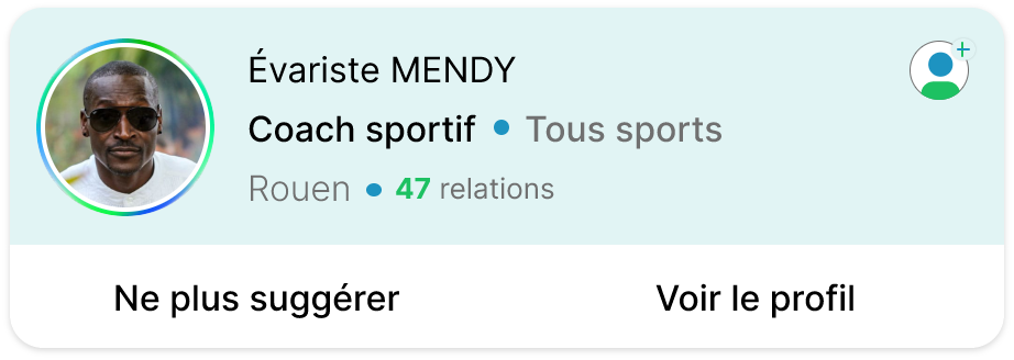 En fonction de votre sport, discipline, type de profil souscrit et localisation, FIND affiche aussi uneliste de recommandations de profils adaptées et pertinentes, pour vous aider à découvrir les talents ou contacts qui vous correspondent le mieux.