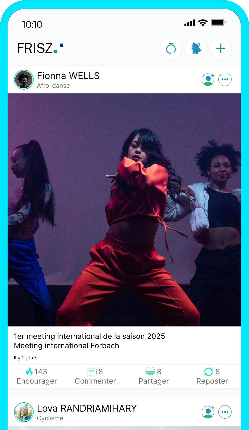 Sur FRISZ, chaque fan est acteur : suivez les athlètes, équipes et clubs de votre choix, accédez à des contenus exclusifs et partagez chaque moment fort avec d’autres passionnés. Retrouvez scores, coulisses, interviews et classements – pour vibrer avant, pendant et après les compétitions.