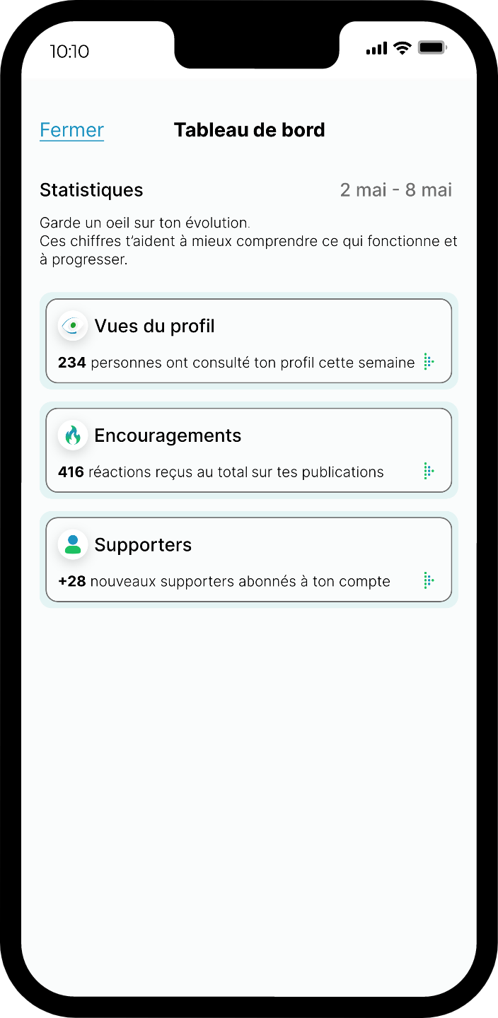 Visualisez vos statistiques de diffusion, interactions et popularité. Gardez le contrôle sur votre évolution et votre impact au sein de la communauté FRISZ.