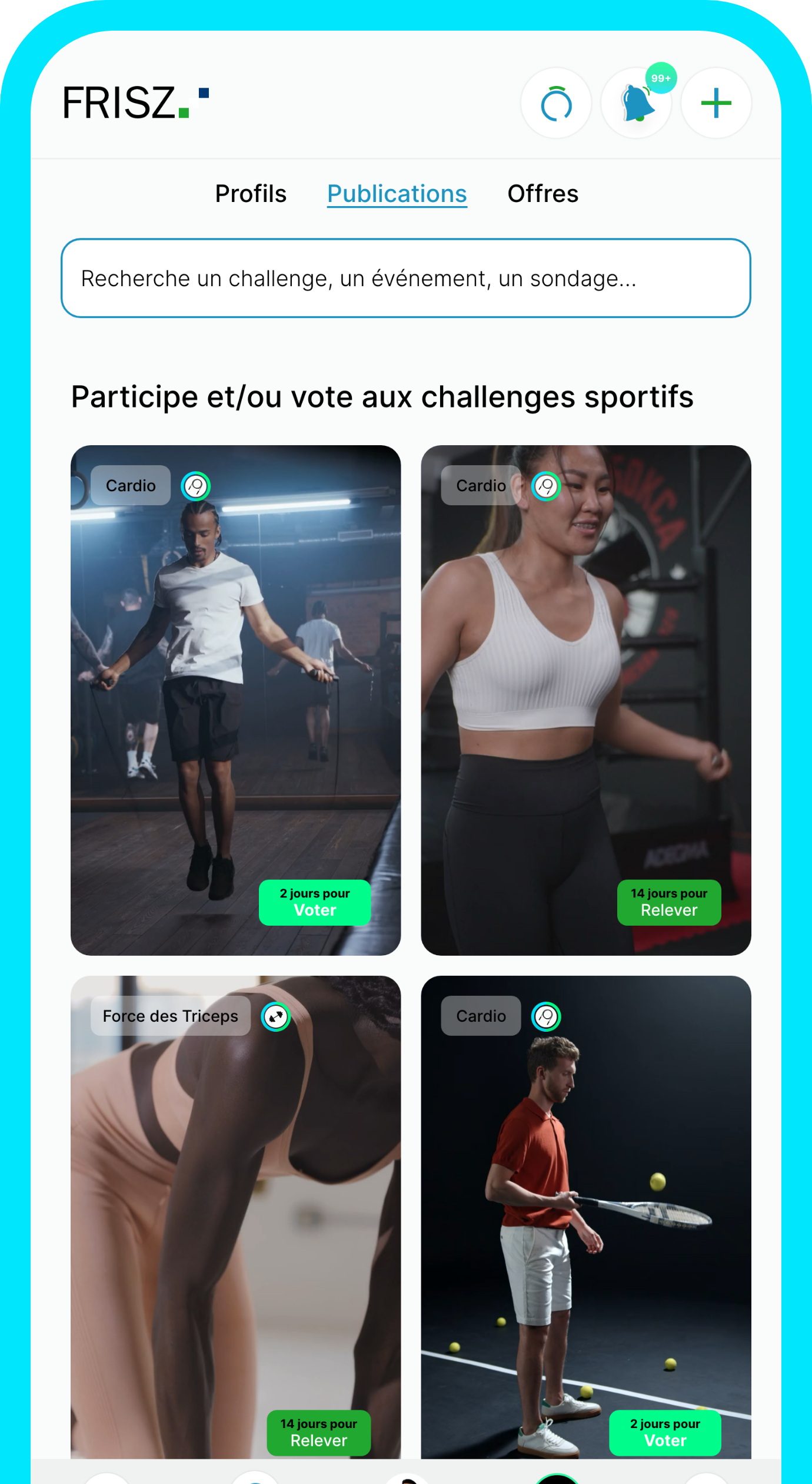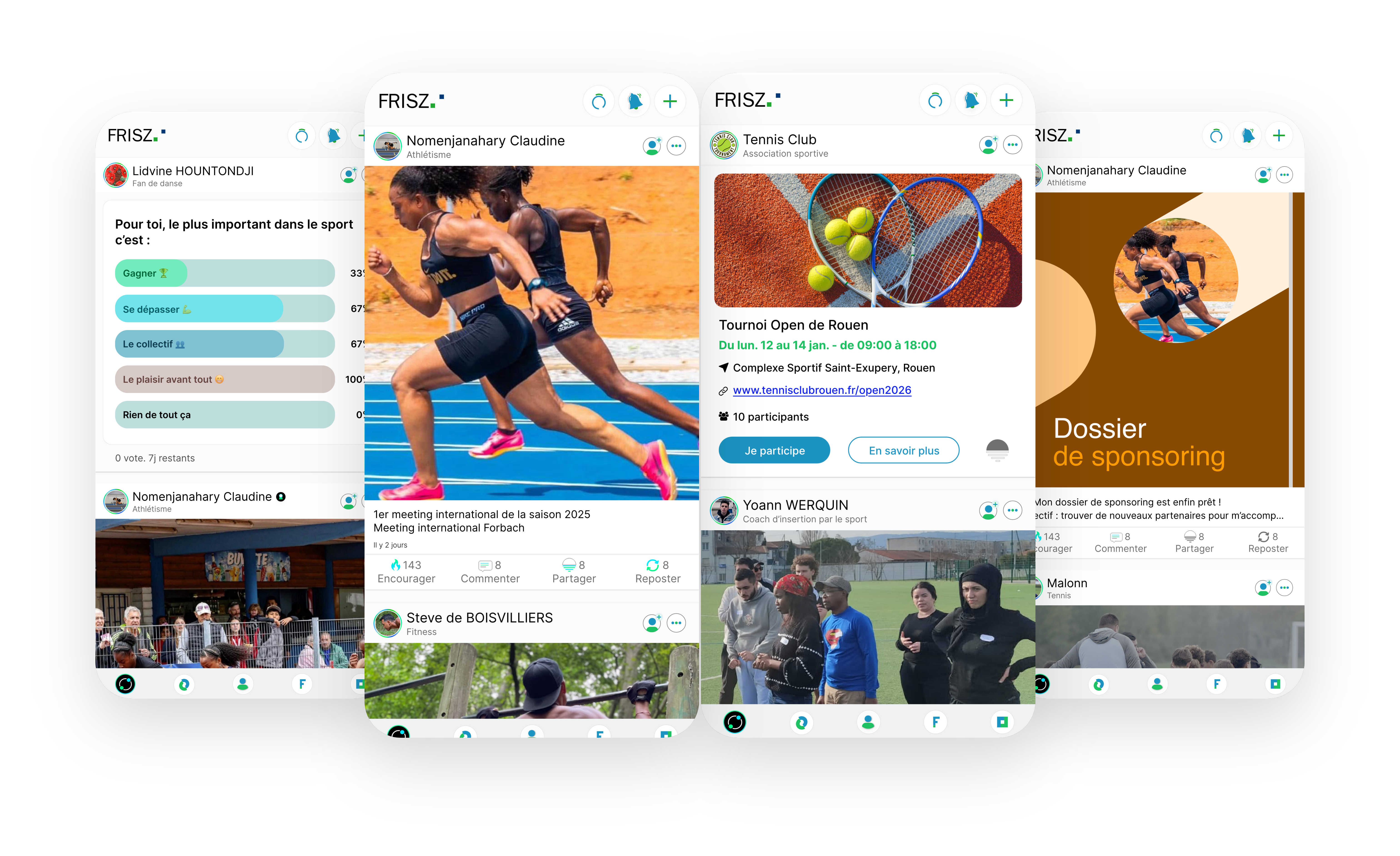 FRISZ est un réseau social dédiée à l’écosystème sportif. Il centralise tous les besoins et flux socio-sportifs en un seul endroit. Que vous soyez sportif amateur ou professionnel, médecin du sport, préparateur sportif, agent, coach sportif, club, association, fédération, ligue ou sponsor… FRISZ vous est dédié. Grâce au fil d’actualité, partagez votre quotidien, des événements, et faites découvrir au monde votre discipline et votre passion pour le sport. Avec le fil de chalLenge, défiez vos amis, vos coéquipiers, et le monde entier. Grâce au profil, renseignez votre parcours, vos informations, et partagez votre histoire en un clic. Enfin, avec la fonctionnalité Find, recherchez ce dont vous avez besoin, que ce soit un événement, un athlète, un médecin, un coach, un sponsor ou un équipementier.