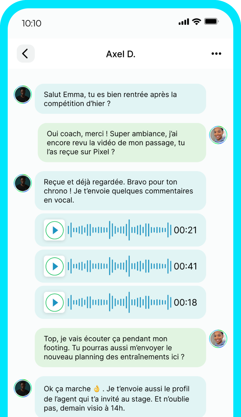 Discute sur Pixel avec des athlètes, clubs, des professionnels du métiers du sport comme des agents, des préparateurs physiques, des entraineurs et des sponsors. Contacte les facilement ainsi que tout membre de la communauté