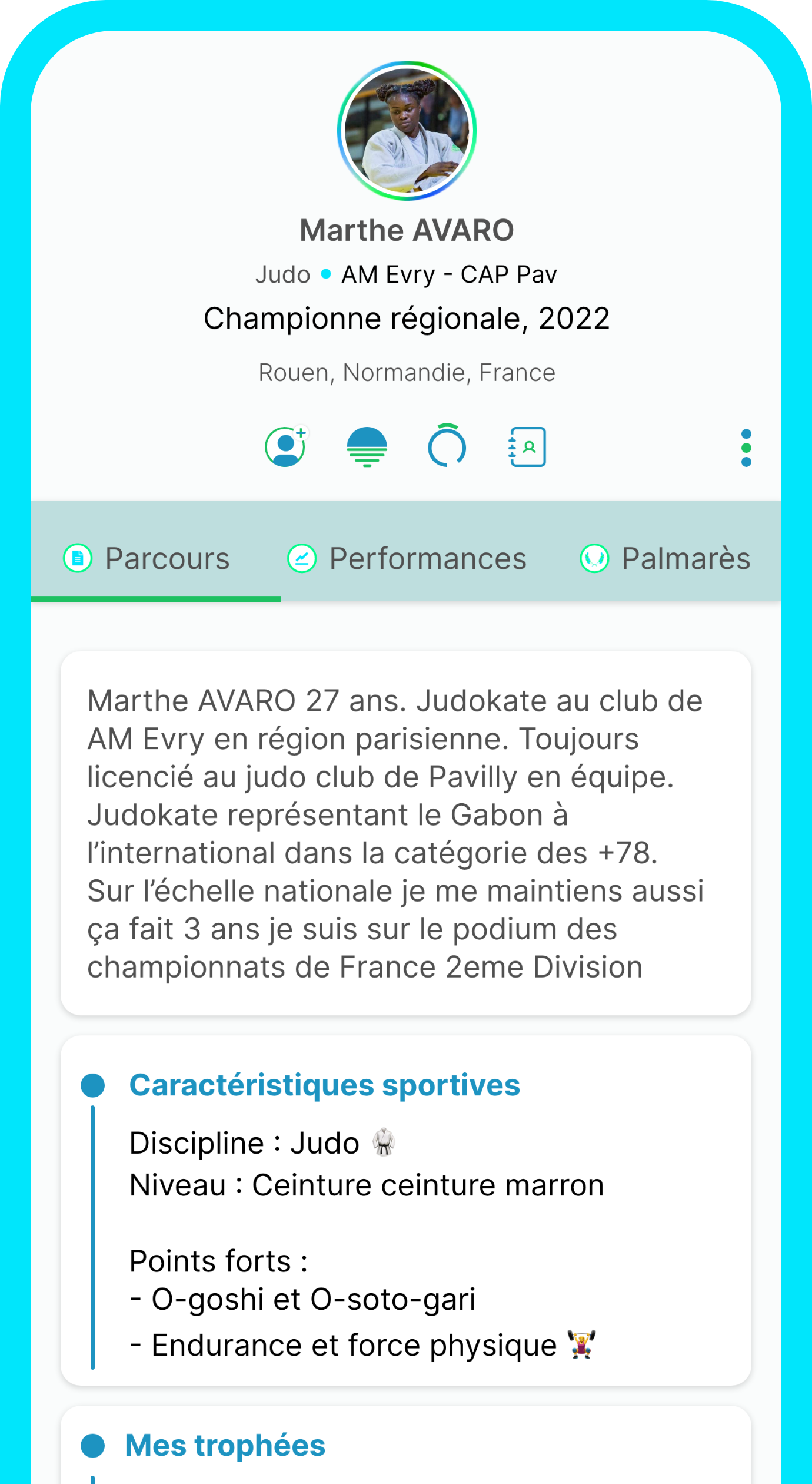 Le Profil FRISZ met en lumière tout votre univers sportif : présentez vos expériences, diplômes, clubs, compétitions, performances et objectifs. Ajoutez vos plus beaux succès, développez votre réseau, et partagez vos expertises en un clic pour attirer clubs, sponsors ou collaborateurs. Un profil riche et dynamique qui évolue selon vos envies.