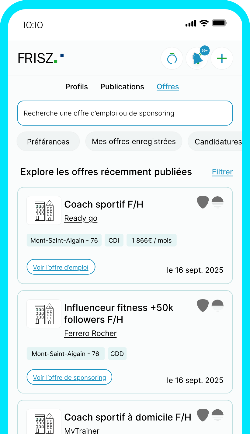 Découvrez toutes les opportunités sportives disponibles : offres d’emploi diffusées par les clubs et organisations, offres de sponsoring publiées par des marques. Vous pouvez facilement soumettre votre candidature ou dossier directement depuis FIND, en utilisant votre profil et vos documents.