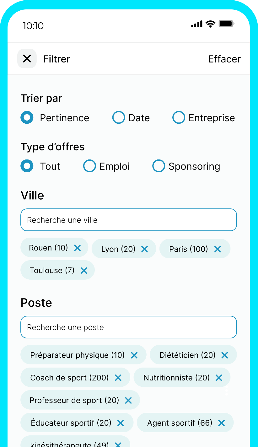 Offres : Consultez en temps réel les offres d’emploi sportives ou les propositions de sponsoring déposées par les entreprises et marques, et postulez facilement avec votre profil et vos dossiers.