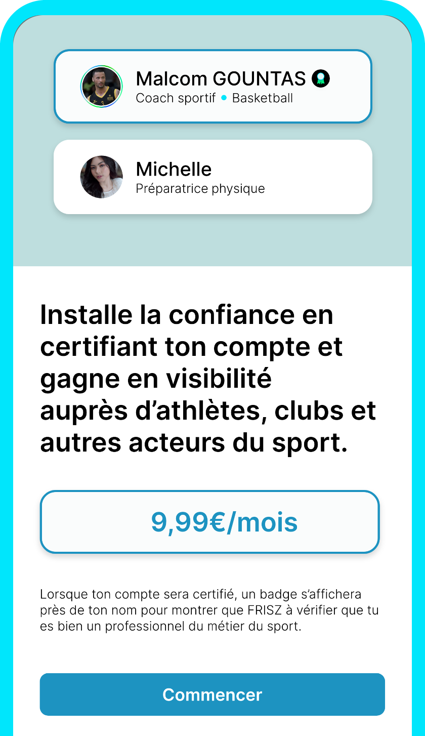 Sur FRISZ, vous avez l’opportunité de créer des liens directs avec des sportifs, des clubs et l’ensemble des acteurs du monde sportif en recherche de votre expertise. Que vous soyez coach, nutritionniste, préparateur physique, agent sportif ou autre professionnel du sport, la plateforme vous permet de développer votre réseau et d’élargir votre clientèle.
