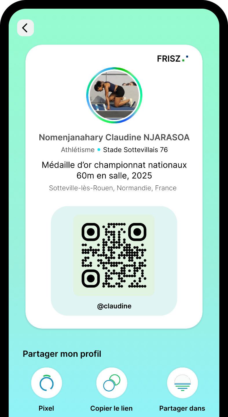 Le profil FRISZ est conçu pour permettre à chaque sportif, professionnel, club, entreprise ou fan de présenter simplement et efficacement son parcours, ses compétences, ses trophées, ses performances vidéos, ses centres d’intérêts, ses affiliations ainsi que tout ce qui fait sa singularité. Créez plusieurs profils selon vos cas d’usage, et switcher facilement d’un profil à un autre, par exemple entre profil sportif ou professionnel.