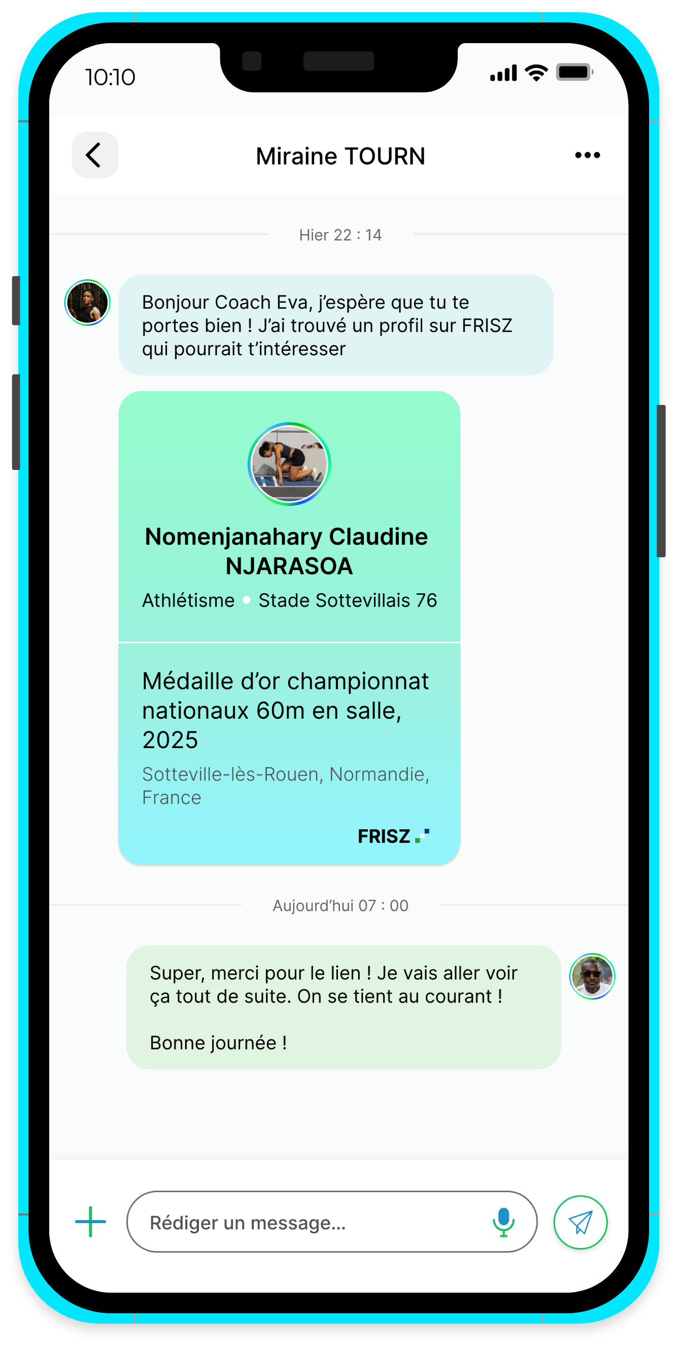 FRISZ, c’est une application que j’attends avec impatience. Pour une athlète comme moi, ce sera un vrai espace pour se faire connaître, partager son parcours et créer des connexions utiles surtout par rapport à la recherche de sponsors. Ce que j’aime, c’est que la plateforme met le sport et les sportifs au centre, sans barrière.