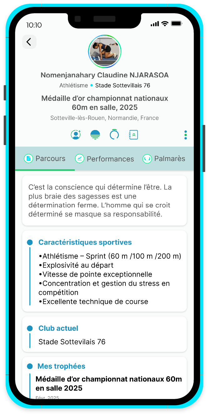 Mettez en avant vos compétences, vos performances et vos réussites grâce à un profil structuré et professionnel. Partagez votre histoire avec le monde entier en un seul clic, et faites de votre profil une véritable carte de visite digitale